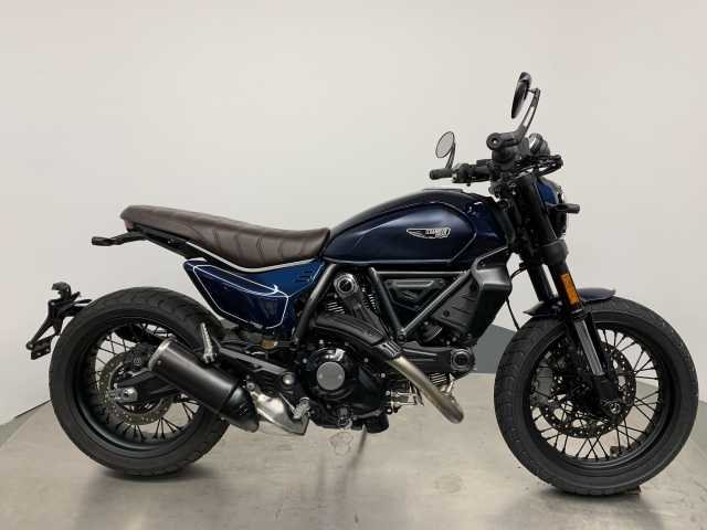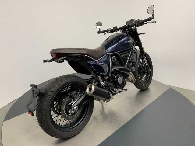 Ducati Scrambler Nightshift in Nebula Blue, ausgestattet mit ABS, Bordcomputer, Traktionskontrolle und Steckdose. Das Fahrzeug ist schon für den A2-Führerschein gedrosselt, kann aber auf offene Leistung zurückgerüstet werden.